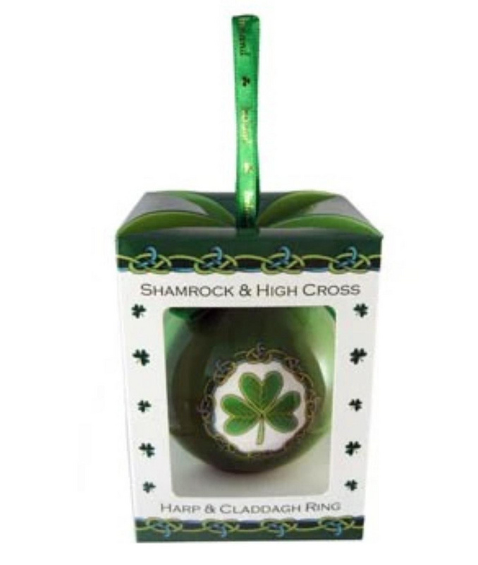 7.5cm Round. Christmas celtic baubel in a box Symbols of Ireland's rich and ancient heritage include the shamrock and the high cross which mark the arrival of Christianity to the island. The harp was on the coat of arms of the King of Ireland as early as the 13th century and the claddagh wedding ring dates from over 400 years ago. Price