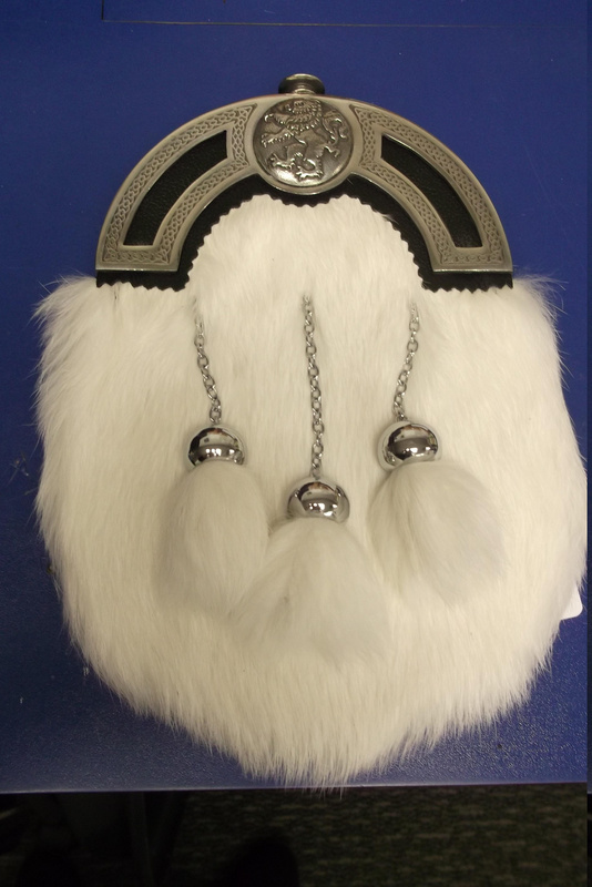 Leather dress sporran with antique lion rampant. Fur is white rabbit. Price