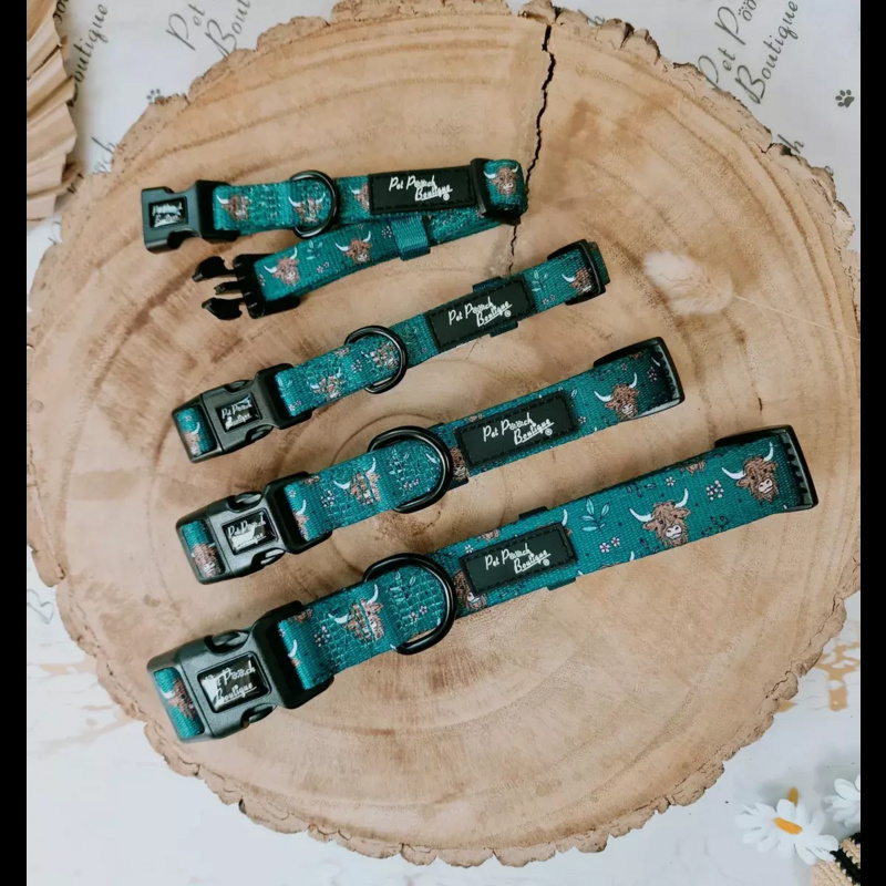 A lush green fabric with hand drawn Highland Cows, meadow flowers and evergreens. Small 28-44cm / 11-17 inch. 1.5cm wide Medium 32-50cm / 12.5-19.5 inch. 2cm wide Large 41-66cm / 16-26 inch. 2.5cm wide