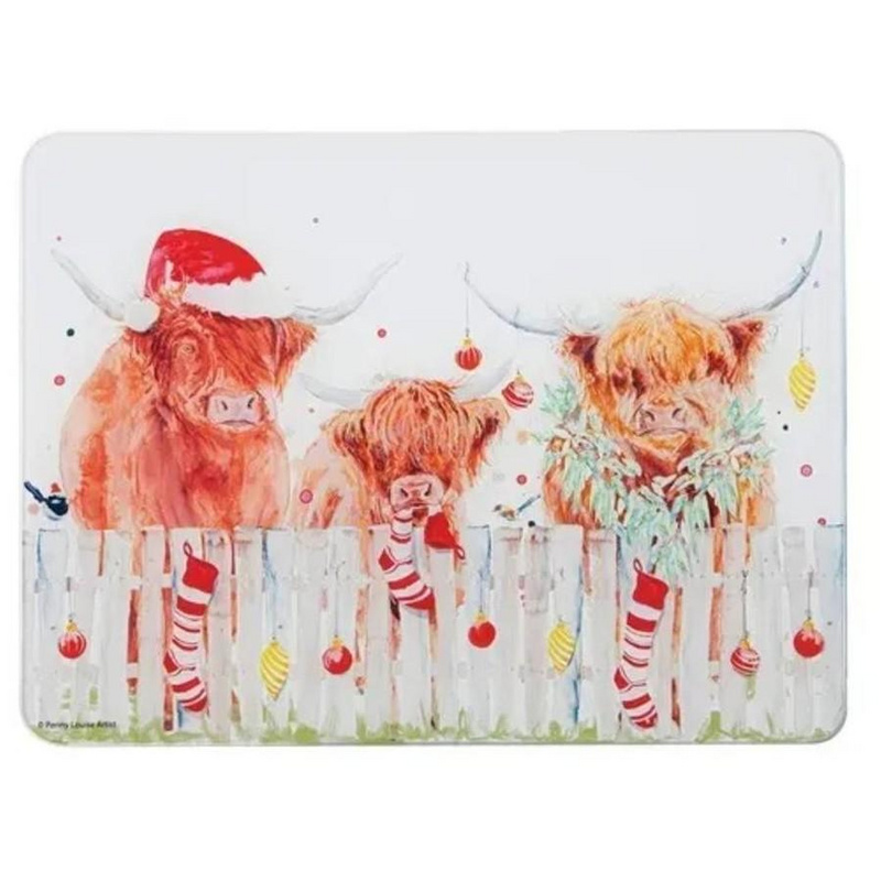 30x40x0.5cm christmas surface protector. Add festive charm to your home with Penny Louise's artwork, featuring adorable Highland "Coos" dressed for the season. These playful, funloving Coo products are perfect for gifting or adding a whimsical touch to your décor—sure to bring smiles and make your holiday extra merry and bright! Price