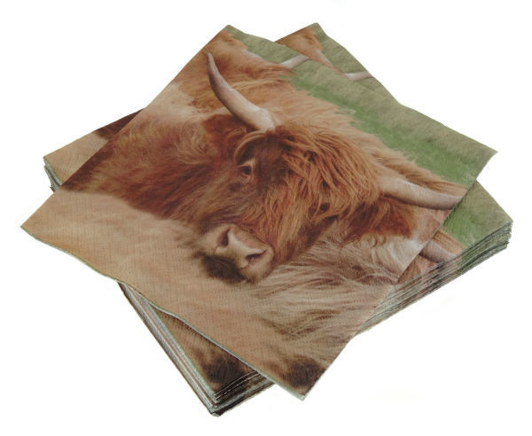 33cm x 33cm 3 ply paper napkins. Pack of 20. A different photograph of a Scottish Highland Cow on each of the four sections. Price