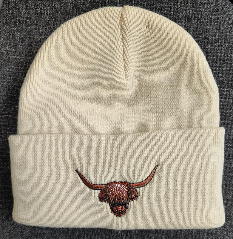 Cuffed Embroidered Scottish Highland Cow Beanie, Slouchy style beanie.