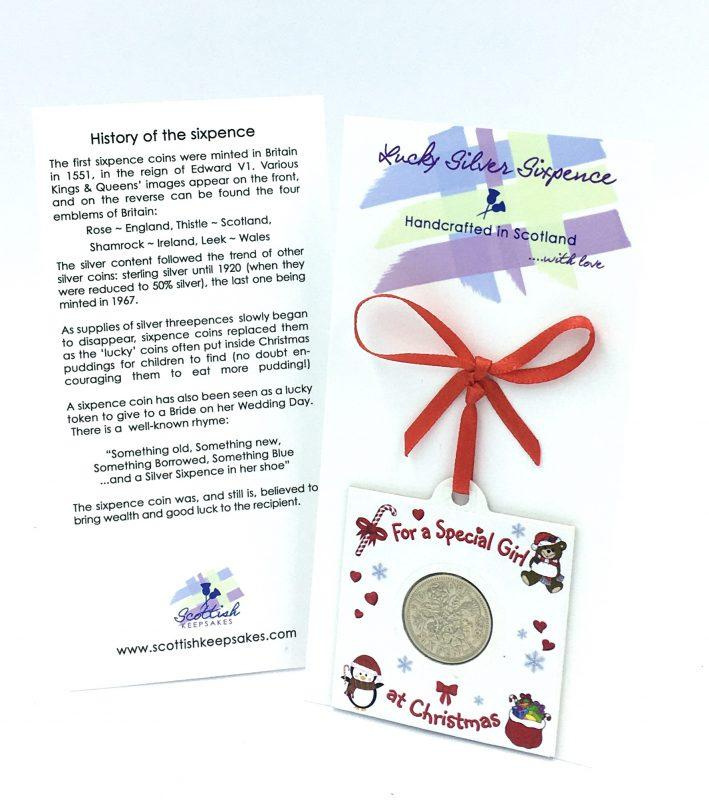 This cute little lucky sixpence is perfect for wishing good luck and prosperity to a special girl at Christmas. Features images of a candy cane, teddy, penguin, toy sack and red ribbon, with a background of little red hearts & snowflakes. ‘For a Special Girl at Christmas’ Finished with a red ribbon. Price