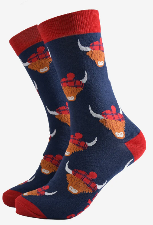 Designed in the UK, these socks are crafted from naturally breathable bamboo. Showcasing Scottish highland cows wearing traditional tartan hats. These red and blue dress socks are eco-conscious and feel luxuriously soft. UK 7-11 | EU 40.5-46 | US 8-12. 70% Bamboo, 27% polyester, 3% elastane. Price