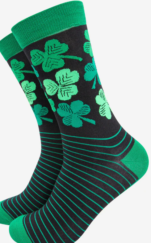 Crafted from naturally breathable bamboo and adorned with a traditional Irish shamrocks and lucky four leaf clovers, these socks are eco-conscious and feel luxuriously soft. Showcasing complementing green stripes and a bold leaf design. UK 7-11 | EU 40.5-46 | US 8-12. 70% Bamboo, 23% Polyester, 7% Elastane. Price