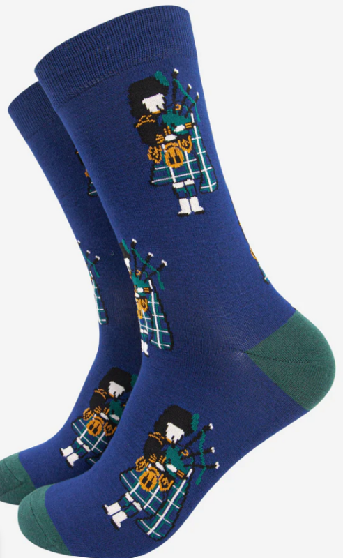 Men's Scottish themed bamboo socks featuring a piper in a traditional Scottish highland dress.