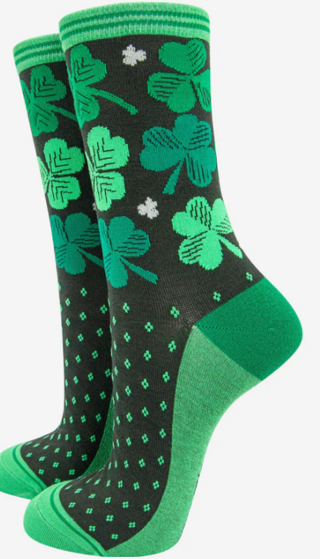 Women's Irish shamrock and four leaf clover bamboo socks with a striped detail cuff.