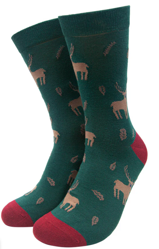 Men's Stag Print Bamboo Socks. An elegant dress sock with an all-over Stag pattern. Ideal for everyday ware. UK Size 7-11, US Size 8-12, EU Size 40.5-46. 70% Bamboo, 27% Polyester, 3% Elastane. Price